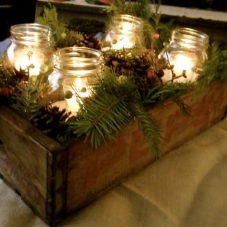 Step Four: Artfully arrange pine branches and holly around the jars.