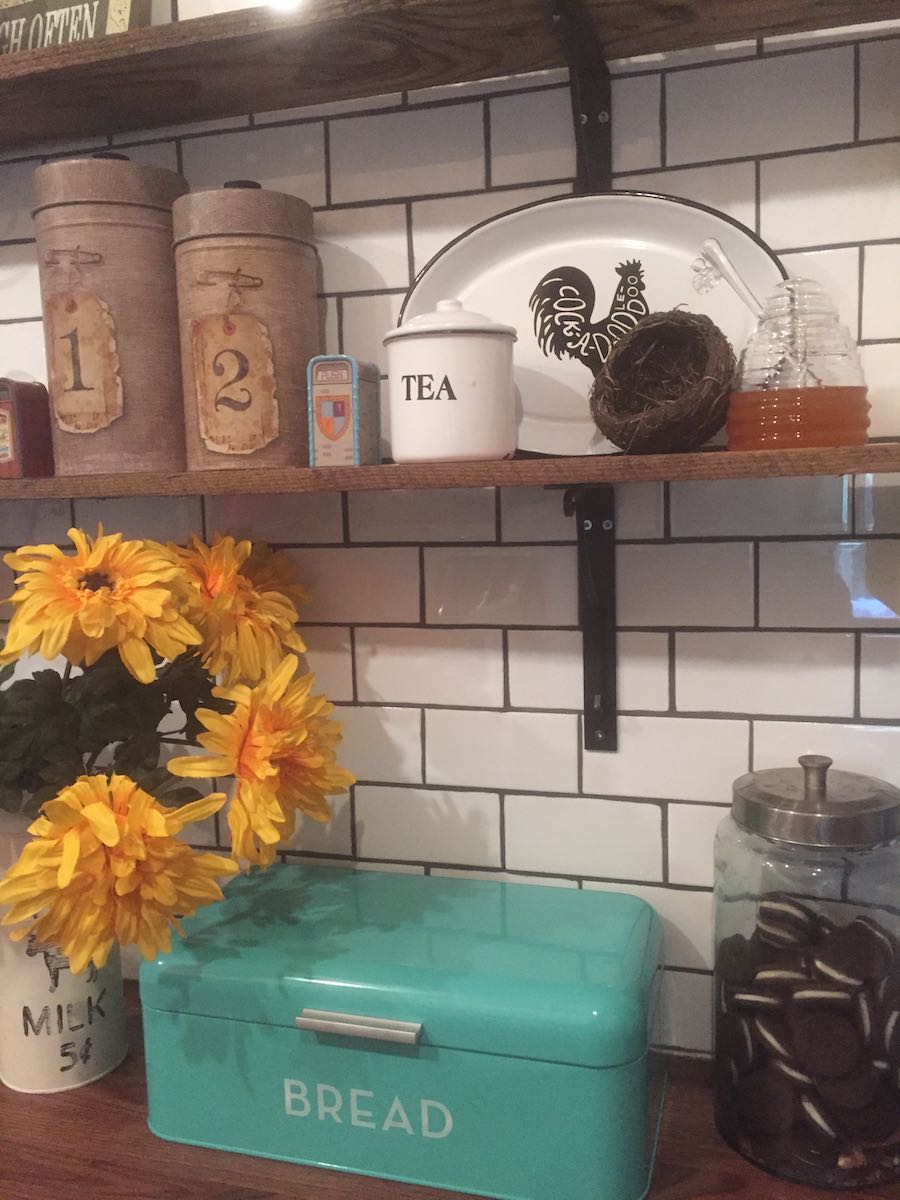 Case in point: I’ve always meant to have one or two upper cabinets and the rest open shelves. That’s exactly what I did too, and because I finally finished tiling the back splash, I could finally put up the shelves.