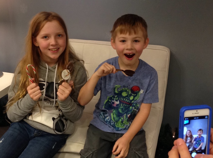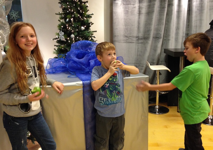 Although I was a little embarrassed at how my kids polished off and dropped a few chunks of chocolate on the all-white table (sorry to anyone from there reading this), they were so thrilled to be there. The bickering stopped, they posed for pictures with the huge gift, smiled while they devoured the treats, and even ate a few apples.
